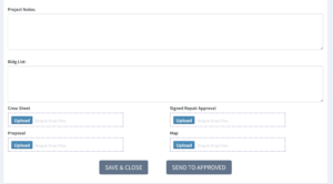 Project Notes is where you enter any additional Specs or any other information the Operations Director or Technicians needs to know about the Job. Upload the Crew Sheet, Proposal if you have one, Signed Repair Approval and the Survey Map from BidBoss. The Crew Sheet MUST be in Windows CSV format.