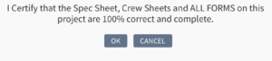 Creating a Job Project: Fill in the information in the boxes. If the Job Address is the same as the Customer Address – select the small checkbox. Enter the Date Job Promised and any other information that the Operations Director / Lead Tech needs to know and then either Save & Close or Send To Approved. Save & Close allows you to come back and work on it again before sending to Operations. Once Send To Approved is selected – the information cannot be changed except the Notes Field. A warning will pop up and ask you to Verify that ALL your information is correct: