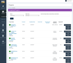 Completed Projects: This screen shows all projects that have been completed by Operations and sent back to the Salesperson for further action or Invoicing. The Salesperson creates the Invoice and sends it to Accounting who then sends it to the customer. Invoice Date and Date Payment received are shown on this screen so the Salesperson can have this information.